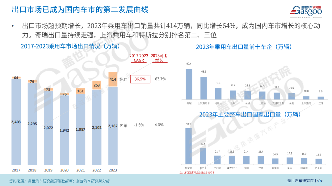 出口方面,中国乘用车的出口市场已是超预期增长。数据显示,2023年中国乘用车出口销量共计414万辆,同比增长64%,成为国内车市增长的核心动力。其中,奇瑞出口量持续走强,上汽乘用车和特斯拉分别排名第二、三位,而比亚迪的出口量也实现了三倍的同比增长,是出口销量排行榜前十名中增长最大的车企。