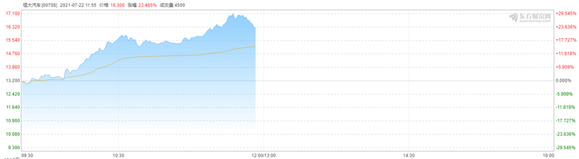 7月22日,在经历数月股价下跌之后,恒大汽车于当日股价持续拉升,上午涨幅一度达到30%。