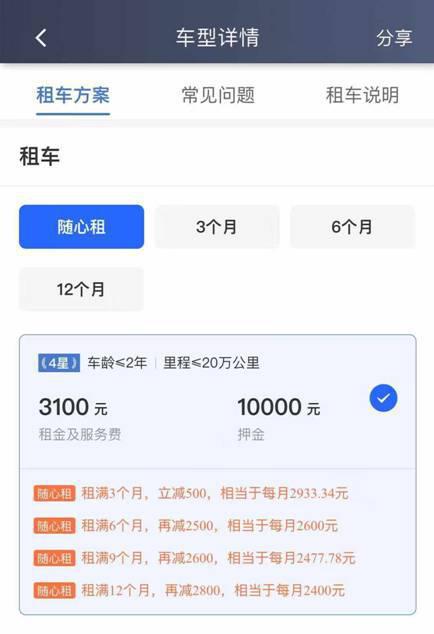 以小桔租车平台上的某款车型为例,在传统的经租方案中,提前退车需要支付剩余租金的20%作为违约金;而“随心租”首月价格为3100元,租满3个月、6个月、9个月、12个月,会分别获得不同金额的租金减免,如果租满12个月,平均月租金仅为2400元。