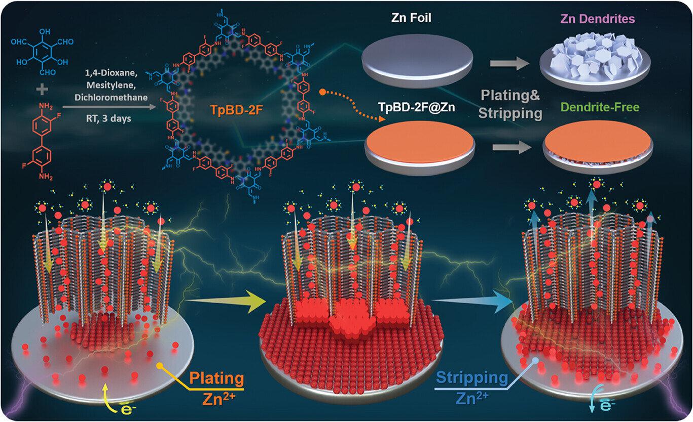 由慕尼黑工业大学自然科学学院无机和金属有机化学系主任Roland A. Fischer教授领导的研究团队为此使用了一种独特的材料:一种名为TpBD-2F的多孔有机聚合物。这种材料在锌阳极上形成一层稳定、超薄且高度有序的薄膜,使锌离子能够有效地流过纳米通道,同时使水远离阳极。