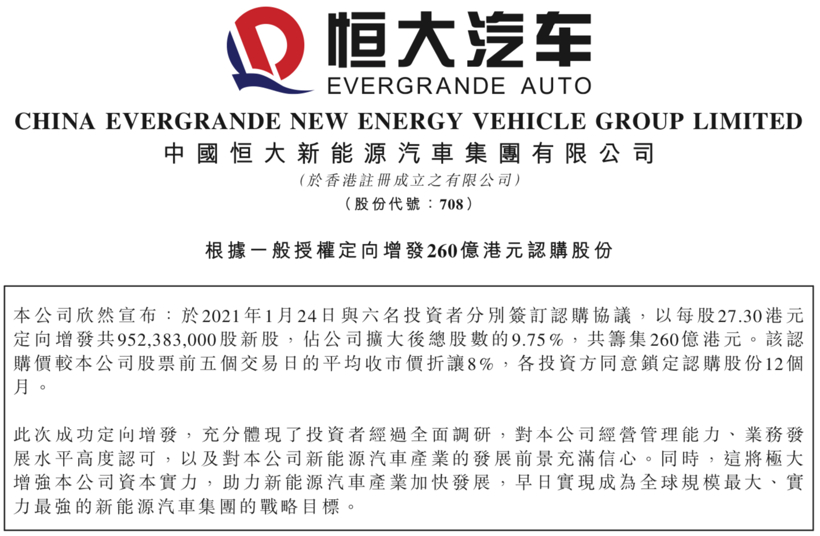 1月24日,恒大汽车发布公告称,公司按前5个交易日平均收盘价折让8%的价格向6名投资人定向增发9.52亿股新股,共引资260亿港元,各投资方自愿锁定12个月。