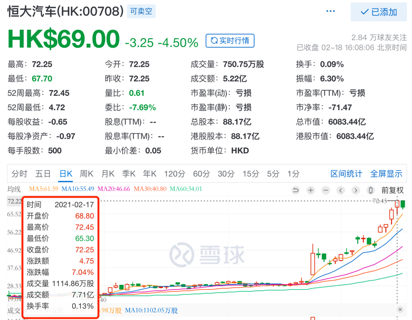2月17日,恒大汽车(HK:00708)市值再创新高。截止收盘,恒大汽车报收72.25港元/股,上涨7.04%,总市值达6369.98亿港元(约合5300亿元),一度超过上汽集团(总市值2561亿元)、长城汽车(总市值3844亿元)