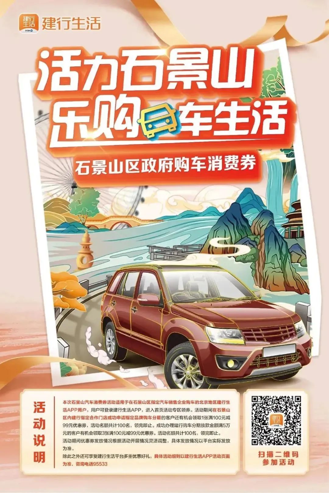 在活动期间,石景山将通过“建行生活”APP平台中的“石景山区政府购车消费券”专区发放消费券,消费者凭券在石景山区内指定汽车销售企业购车,即可享受优惠补贴。