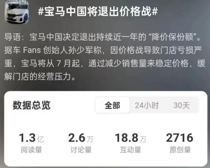 总结起来,宝马之所以宣布退出价格战,本质上是想要保持品牌调性,但又担心用户一时难以接受,客户流失过于严重,因此用免息代替了原本的现金优惠,而免息是否为缓兵之计,有待观察。