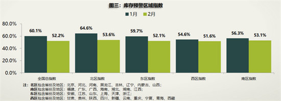 从区域指数情况看,北区指数为53.6%,东区指数为52.1%,西区指数为51.6%,南区指数为53.1%。流通协会表示,2月作为销售淡季,经销商进车任务量减少,各区域库存压力有所降低。