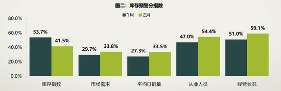 从分指数情况看,2月库存指数环比下降12.2%,库存压力减弱。市场需求指数、平均日销量指数、从业人员指数、经营状况指数环比均有所上升。