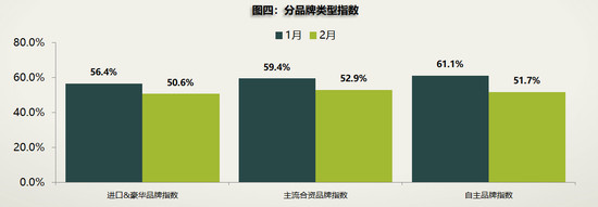 从分品牌类型指数看,2月进口&豪华品牌指数环比下降5.8%,自主品牌指数环比下降6.5%,主流合资品牌环比下降9.4%。豪华品牌继续被消费升级趋势带动,整体增长势头较强,其库存预警指数也更接近理想状态。相比之下,合资和自主品牌库存预警指数较高。