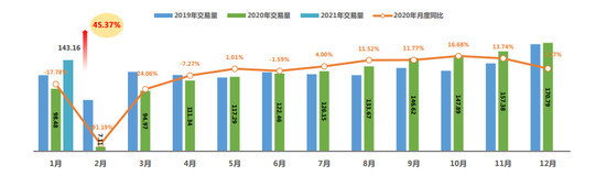 1月,全国二手车交易量环比下降16.18%,同比增长45.37%,环比下降是因为大部分购车需求在去年12月已经释放,同比大幅增长则主要因为去年春节与疫情双重影响,市场基数较低。