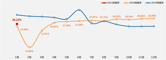 在转籍率方面,2021年二手车市场表现出不同以往的活跃性。1月二手车转籍比例为26.22%,同比增长1.16%。流通协会表示,2月10日商务部印发的《商务领域促进汽车消费工作指引》指出,除部分大气污染防治重点地区外,全面取消二手车限迁,同时促进跨省通办业务开展,提高二手车交易的便利性。预计今年二手车转籍率将持续增长。