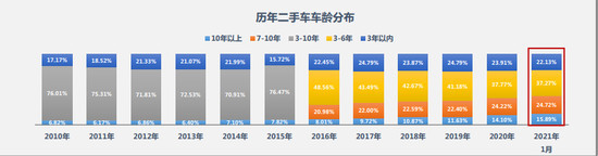 在车龄结构方面,1月,二手车使用年限在3-6年的交易量仍为最多,共交易53.35万辆,占比37.27%,与历年数据相比呈降低趋势;使用年限在3年内车型共交易31.68万辆,占比也进一步萎缩至22.13%;车龄在7-10年的车型交易35.39万辆,占比扩大至24.72%;车龄10年以上的车型交易22.74万辆,占比增加至15.89%。