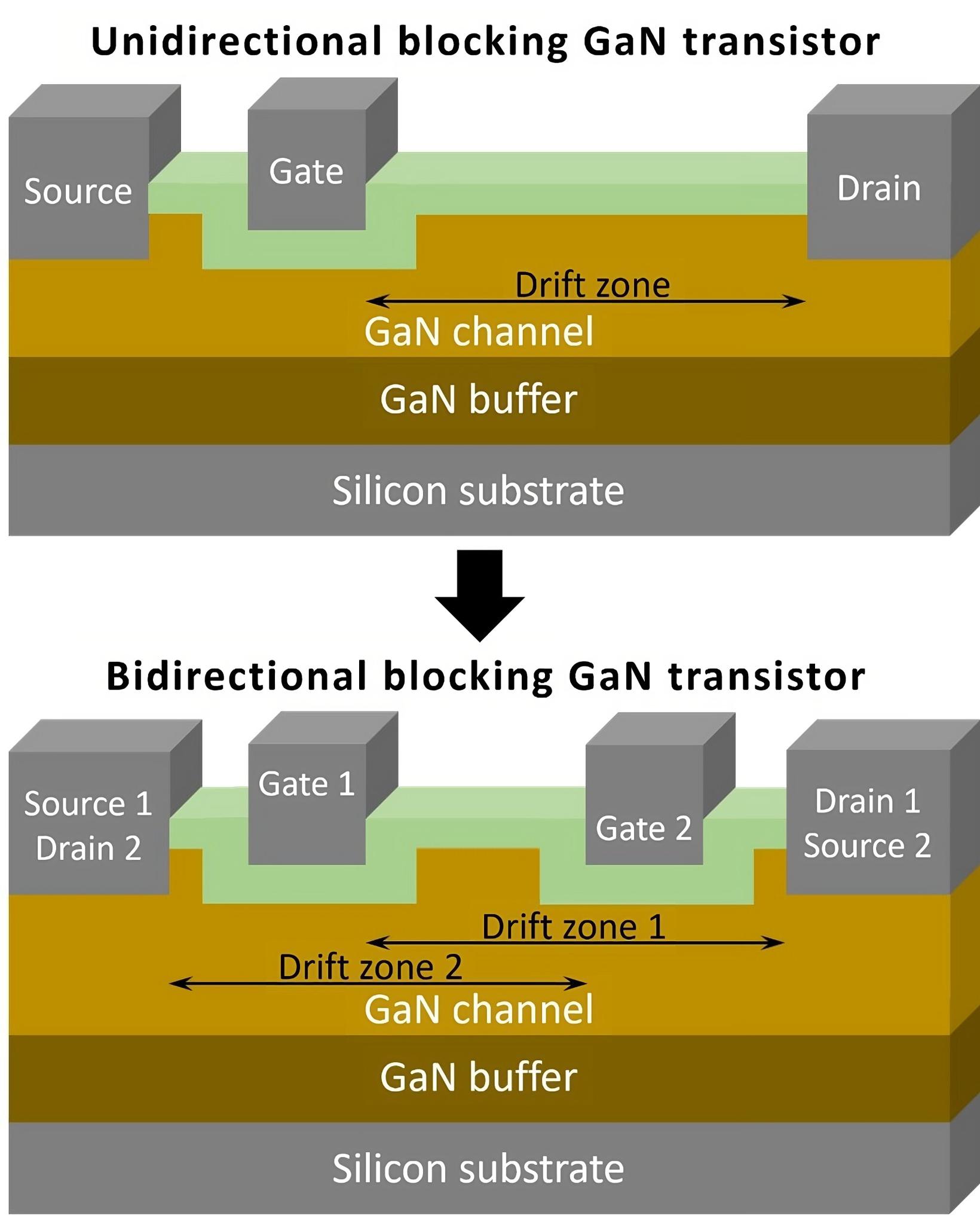 有源整流器(例如电动汽车中使用的整流器)利用氮化镓(GaN)或碳化硅(SiC)半导体的功能,可以在更小、更便宜的无源硬件中处理更高的开关频率。然而,与双向GaN晶体管不同,当前系统只能将电压锁定在一个方向上。它们具有两个栅极结构来处理负电压和正电压,这使得新的开关架构对于公共电网使用的转换器和整流器特别有吸引力。