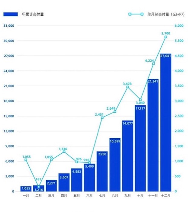 2021年开端,小鹏汽车公布了2020年12月及全年销售数据。12月单月交付量达到5700辆,同比增长326%,创下历史最高记录。其中,小鹏P7单月交付量达3691辆,小鹏G3单月交付2009辆。第四季度累计总交付量为12964辆,全年累计交付27041辆,同比增长112%。